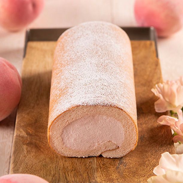 ピーチ風味の生地でピーチクリームを包んだ桃の風味豊かなロールケーキ。