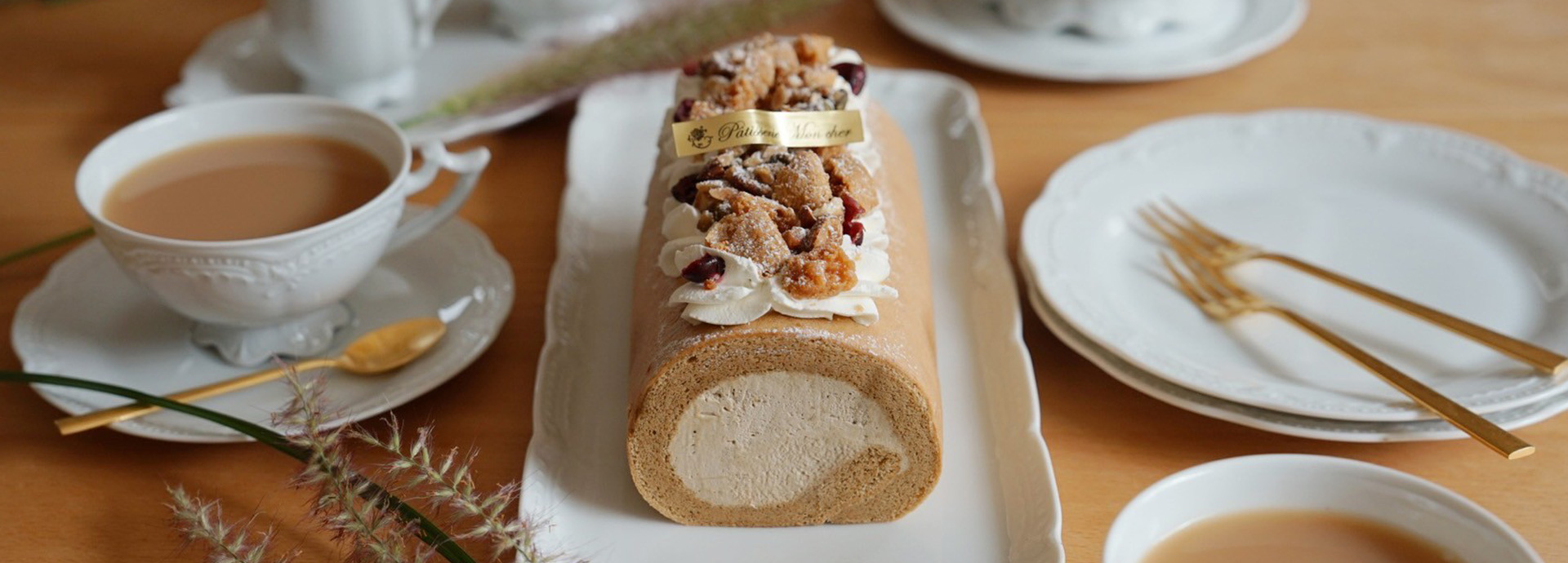 生地とクリームに香り高い紅茶を合わせた、紅茶好きのためのロールケーキに、クランベリーやナッツで華やかにデコレーションしました。