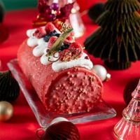 仕上げにはフランボワーズ風味のショコラをかけ、色とりどりのベリーで飾った、聖夜を華やかに演出するロールケーキです。