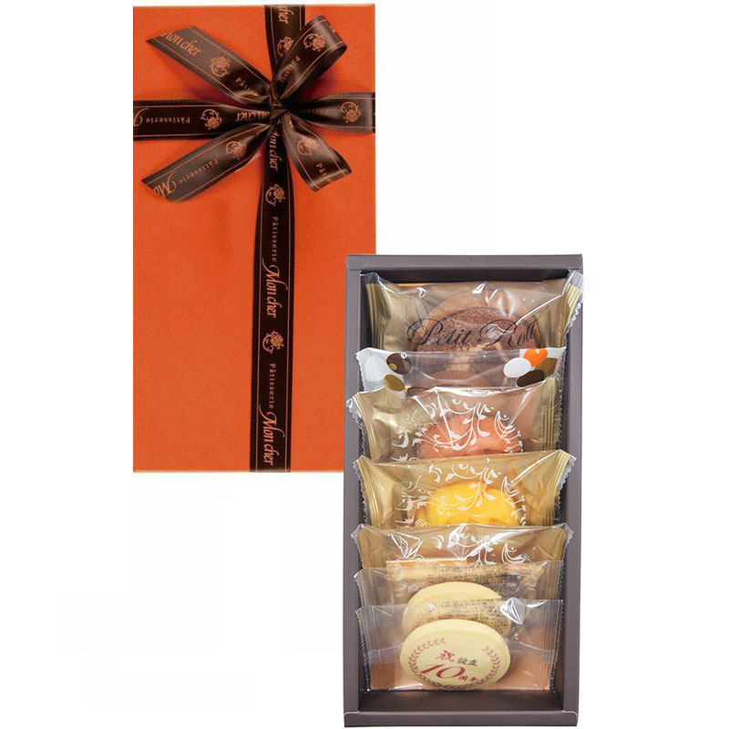 ぱっと目を引くほど鮮やかなオレンジ色のボックスとブラウンのリボンは、モンシェールを象徴するパッケージです。