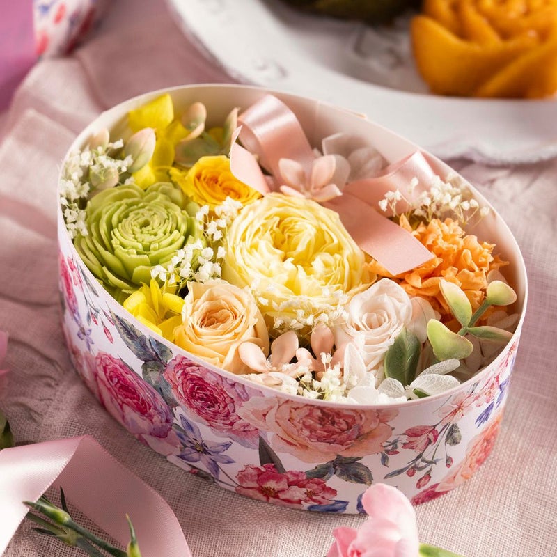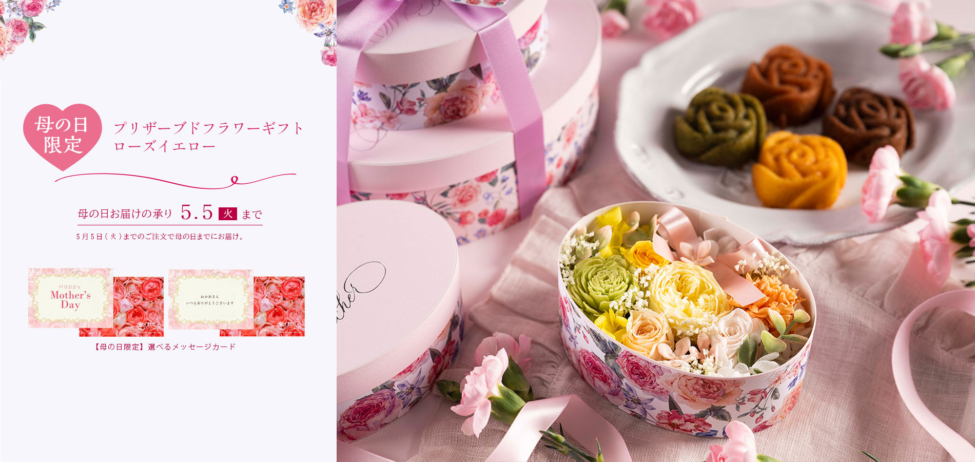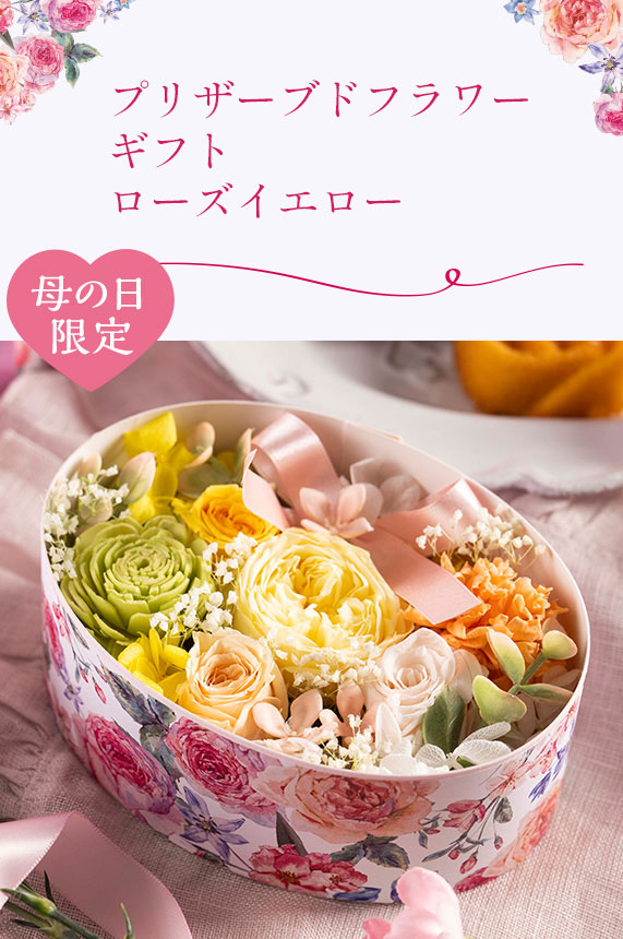 花とみどりを通じて真に豊かな社会づくりに貢献すす、日比谷花壇がアレンジしたプリザーブドフラワー「ローズピンク/イエロー」と、ケーキのようにしっとりとした口あたりのMon cherのロングセラー「バラのフィナンシェ」をセットにした、母の日のギフトに喜ばれるなスペシャルセット。 母の日限定の華やかなボックスに詰め合わせてお届けいたします。