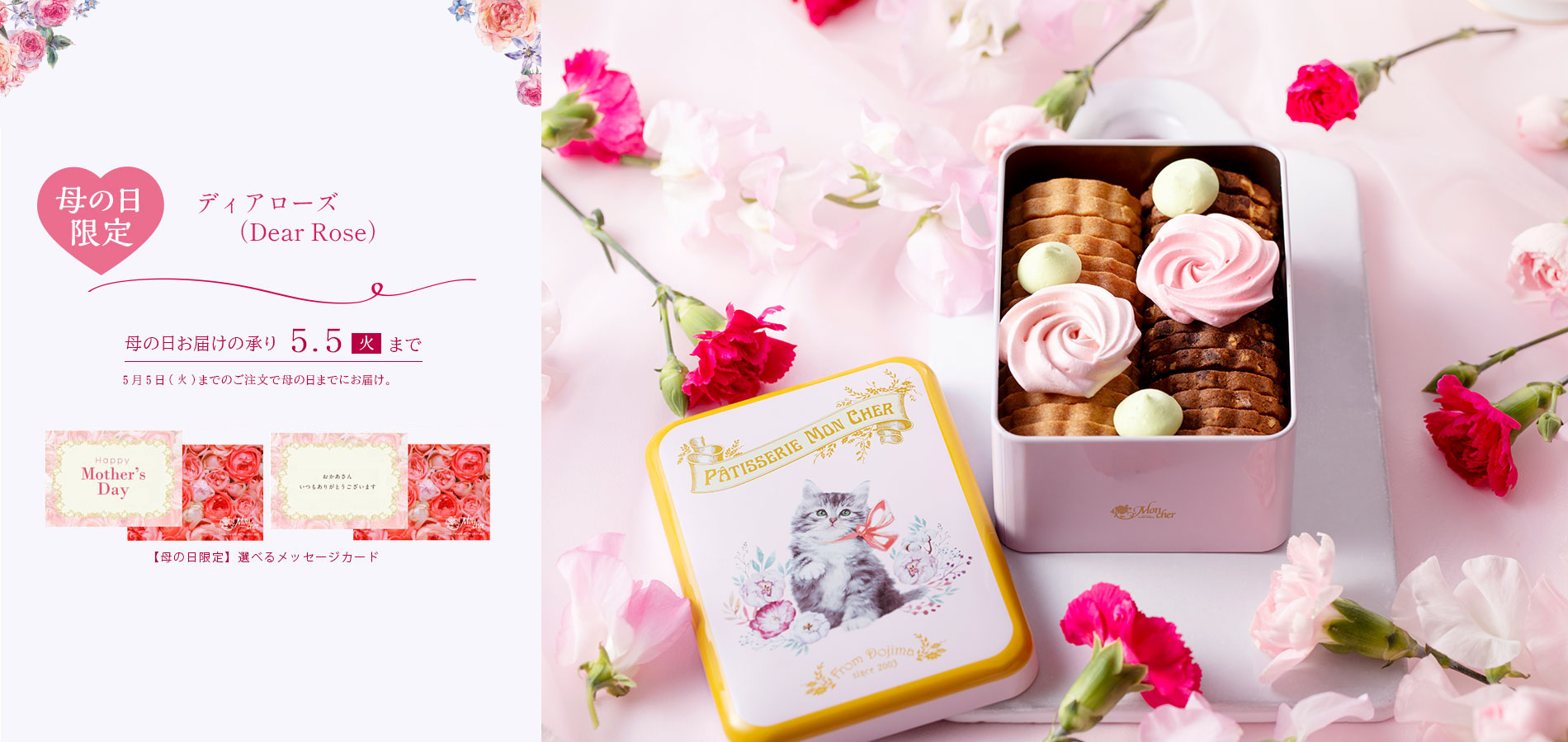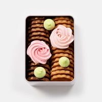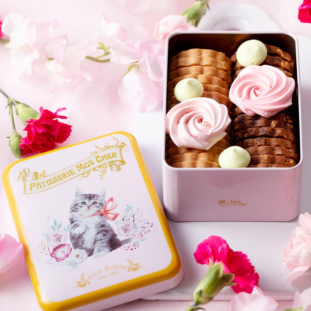 愛らしい猫が描かれた缶の中は、香ばしく焼きあげたサブレと、華やかなバラを思わせる2色のメレンゲ。