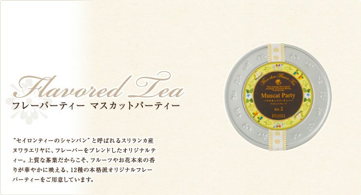 他の画像を見る フレーバーティー マスカットパーティ 宅配便(冷蔵可) ¥ 864 税込 常温便 香る紅茶 スリランカ(旧称セイロン)ヌワラエリアの茶葉に「マスカット」の華やぐ香りをプラスしたフレーバーティー。 詳細を見る お気に入りに登録する