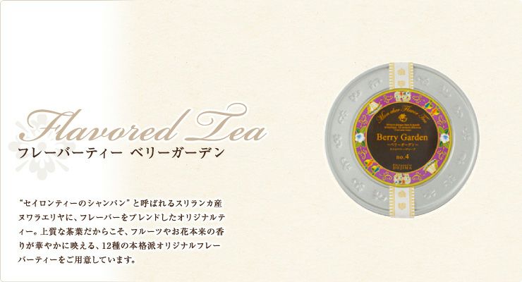 他の画像を見る フレーバーティー ベリーガーデン 宅配便(冷蔵可) ¥ 864 税込 常温便 香る紅茶 スリランカ(旧称セイロン)ヌワラエリアの茶葉に「ベリー」の華やぐ香りをプラスしたフレーバーティー。 詳細を見る お気に入りに登録する